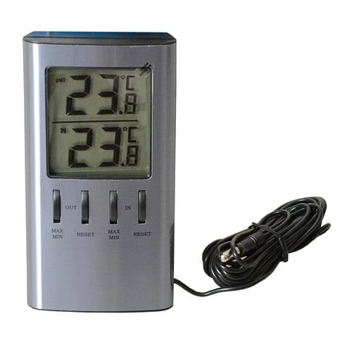 Praktisk digitalt termometer for måling av temperatur både innendørs og utendørs. Gir enkel og tydelig avlesning, og egner seg godt til bruk i bolig, hytte eller verksted.