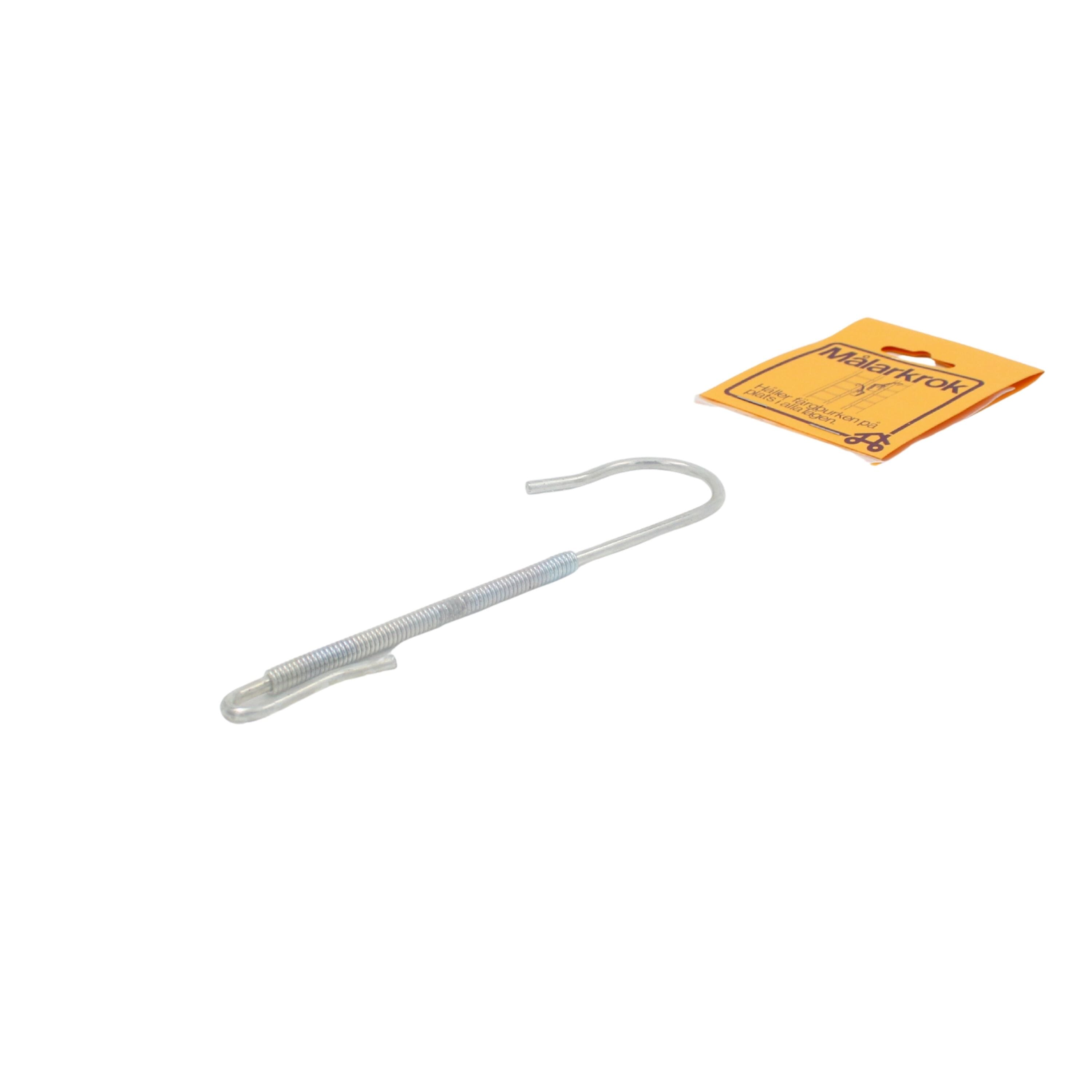 Malerkrok i stål med fjær, utviklet for praktisk oppheng av malingsspann, verktøy og tilbehør under malerarbeid. Kroken festes enkelt i spannets hank og kan henges på stige, stillas, rekkverk eller lignende.
