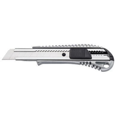 Solid knekkekniv med aluminiumshåndtak som gir godt grep og høy slitestyrke. Kniven har metallføring for stabil bladføring og automatisk bladlås som holder bladet sikkert i ønsket posisjon.