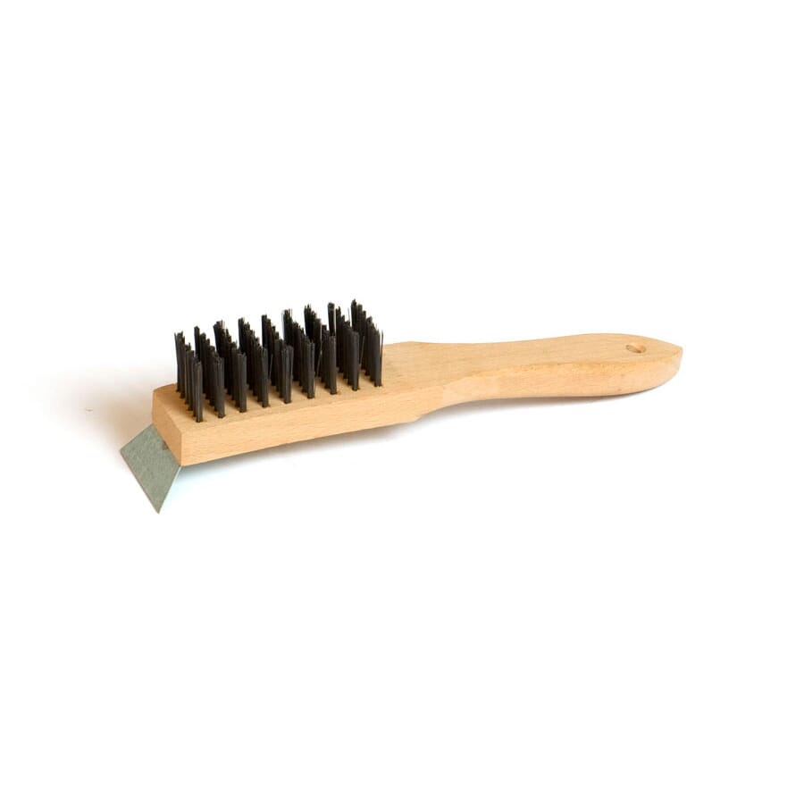 Robust stålbørste med trehåndtak, utstyrt med integrert stålskrape. Børsten har ståltråd med 0,30 mm diameter, godt egnet for effektiv rengjøring, fjerning av rust, maling, pussrester og annen hardtsittende smuss på ulike overflater.