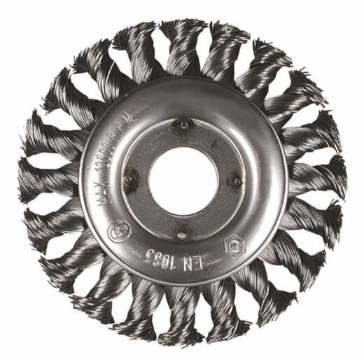 Kraftig hjulbørste med knytt ståltråd for krevende rengjøringsarbeid på metall. Egnet for bruk med vinkelsliper.