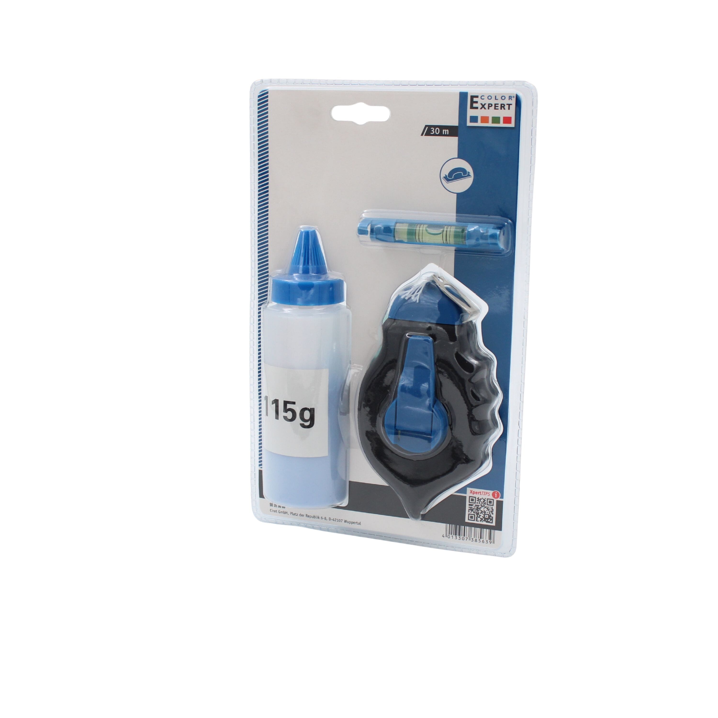 Praktisk krittsnor-sett for oppmerking av rette linjer på vegger og gulv. Snoren fylles med merkepulver og trekkes ut til ønsket lengde før den festes med kroken. Den medfølgende mini-vateren gjør det enkelt å justere snoren slik at linjen blir rett.