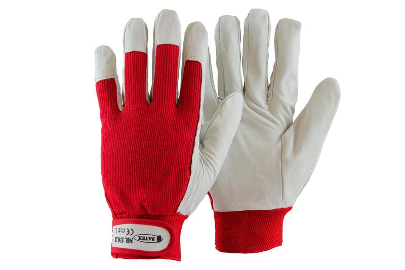 Monteringshanske i mykt svinenappa med håndbak i rødt bomullstoff og med borrelås.